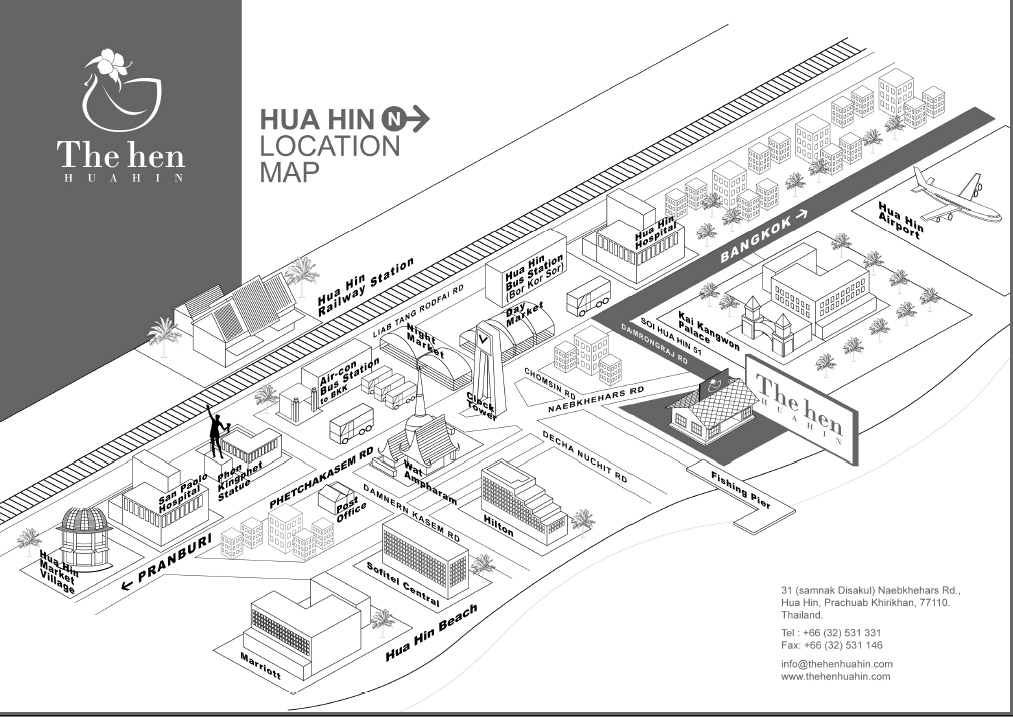 The Hen Hua Hin 31(Samnak Disakul) Naebkhehars Rd.,Hua Hin, Prachuab Khirikhan, 77110 Thailand. |